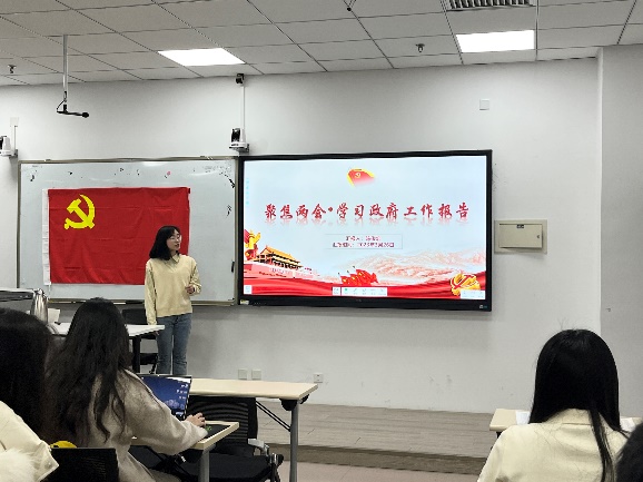 本次活动分为三个部分。首先由哲学学院陈俊宏同志作以《聚焦两会•学习政府工作报告》为题的报告,带领大家走进2023年全国“两会”。他先介绍了全国“两会”的由来以及具体构架,而后带领大家以时间轴的形式回顾了2023年全国“两会”的几个重要时刻。就业是最基本的民生,促进高质量充分就业是党和国家践行以人民为中心发展思想的内在要求,也是增进民生福祉、提高人民生活品质的基本支撑。陈俊宏对政府工作报告中的就业部分进行了重点讲解。他向同志们分享了政府工作报告中就业部分的原文,通过数据展示了我国当前的就业趋势,并结合实际讨论了党和国家在高校毕业生就业方面的相关倡议。陈俊宏的党课报告使支部成员较为全面地了解了本次全国“两会”所取得的各项成果,真切体会到党中央全心全意为人民服务、带领全体人民奋力开创事业发展新局面的坚定决心与有力作为。