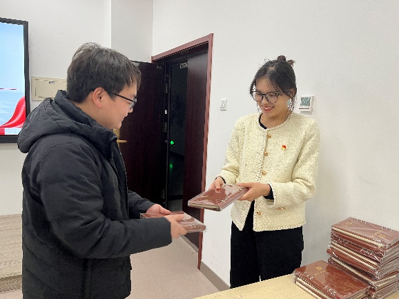 会后,化学学院2022级博士生党支部书记李祥园向支部成员分发理论学习笔记本。