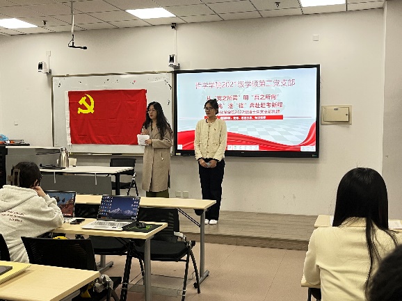 一年春作首,万事行为先。为深入学习贯彻党的二十大和“两会”精神,加强支部同志间的沟通与学习,2023年3月26日,化学学院2022级博士生党支部与哲学学院2021级学硕第二党支部在前主楼A803教室开展从“党之所需”明“吾之所向”,追“光”逐“锋”奔赴赶考新程支部共建活动。活动由化学学院2022级博士生党支部书记李祥园、哲学学院2021级学硕第二党支部书记赵浩然共同主持,支部全体党员参加。