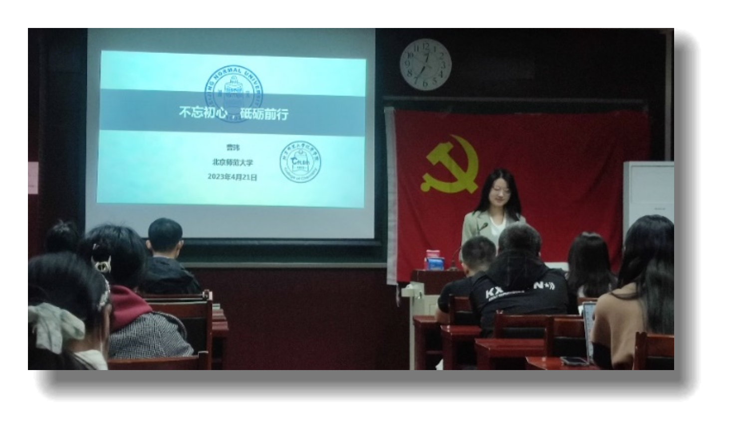 习近平总书记在党的二十大报告中鲜明提出,要实施科教兴国战略,强化现代化建设人才支撑。为新时代青年指明了奋进方向,青年师生要用自己的实际行动筑牢国家强盛之基,为全面建设社会主义现代化国家而不懈奋斗。为了更好地领悟科学精神,坚定科研初心,促进学生与优秀青年教师之间的交流与分享,2023年4月21日晚19时,北京师范大学化学学院探微党支部、2021级硕士生一班党支部和2021级博士生党支部的支部成员在化学楼东小院二楼会议室开展了党支部联合共建活动,邀请到了北京师范大学化学学院青年教师党员曹玮老师进行党课宣讲。本次宣讲活动由2021级硕士生一班党支部书记孙璐主持。