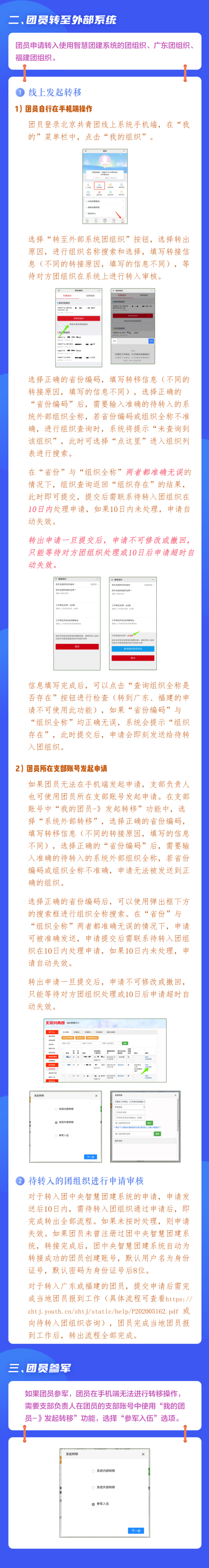 各类学校团组织将于新生入学一个月内,在各类线上系统创建新生所属团组织,并审核接收新入学的学生团员团组织关系转接申请。转出团组织和团员本人可在录取学校新生团组织创建后,登录北京共青团线上系统申请将组织关系转出。转出团组织不得将已升学的毕业学生团员组织关系转至团员居住地或户籍所在地团组织。
