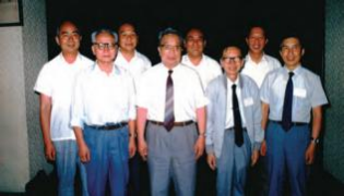 ▲ 刘若庄与唐敖庆等人合影(前排左起 : 邓从豪 、唐敖庆 、刘若庄 、鄢国森;后排左起 : 江元生 、孙家钟 、张乾二 、戴树珊)