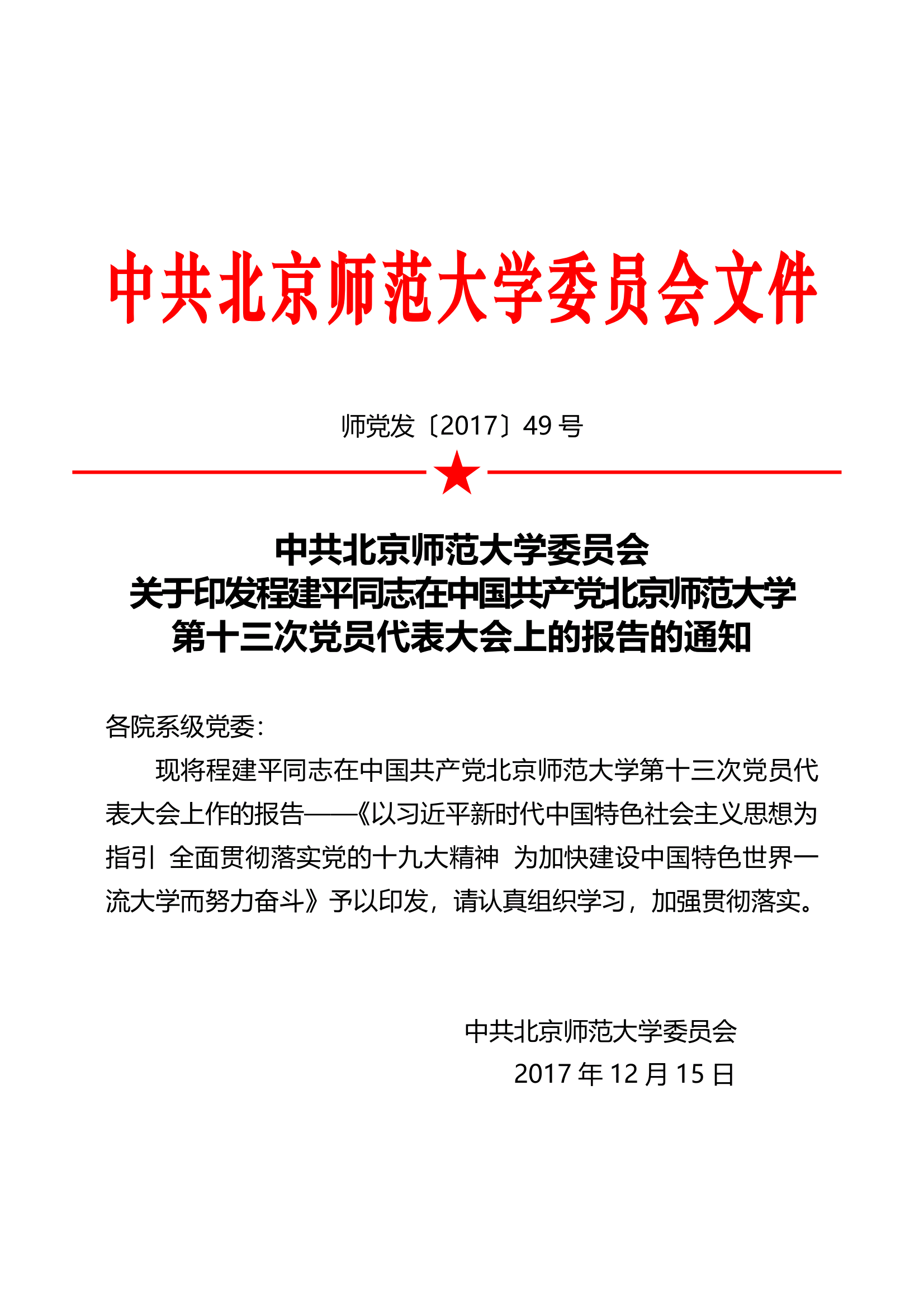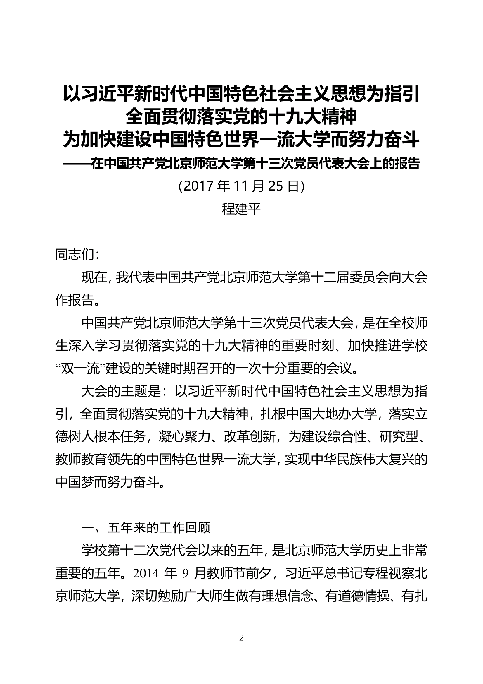 程建平书记在北京师范大学第十三次党代会上的报告