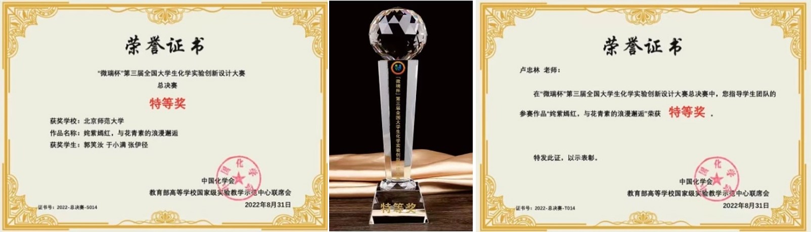微瑞杯第三届全国大学生化学实验创新设计大赛总决赛于821-24日在厦门大学举行,由全国各赛区选拔出90所高校的90支队伍参加最高层次的角逐。竞赛设置特等奖(18个)、一等奖(33个)和二等奖(39个)。在激烈的竞争中,化学学郭笑汝、于小满、张伊径团队的科普实验作品《姹紫嫣红,与花青素的浪漫邂逅》凭借着巧妙的创意和精彩的阐释,荣获总决赛特等奖殊荣。