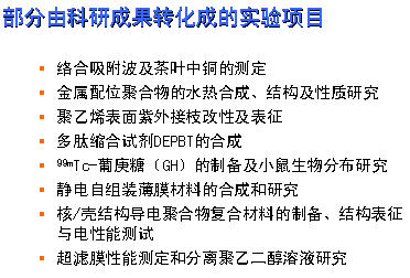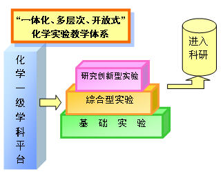 新的实验教学体系分为基础实验、综合性实验和研究创新型实验三个层次。增加综合性、设计性、研究性实验,减少验证性实验。2007年以来,新增实验项目 58项,其中24项是由教师科研成果转化而来的化学综合设计实验,鼓励学生自拟实验题目,开展创新实验。