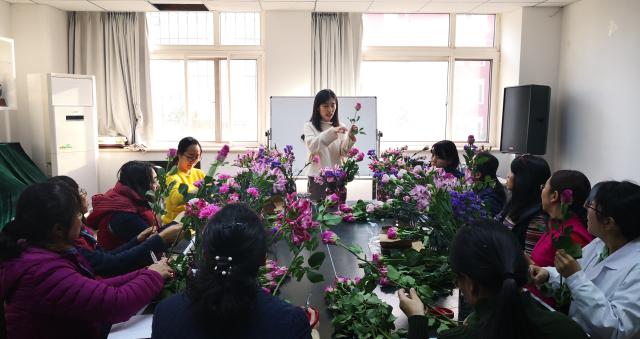 为了丰富化学学院女老师的精神文化生活、陶冶情操、提高艺术修养,2018年11月28日下午,化学学院工会组织学院女老师20余人参加了“冬之花”插花艺术讲座。此次活动专程聘请了花艺师带领大家走进插花艺术的海洋,去领略不一样的插花艺术,感受从自己手中绽放的绚烂,使女老师们在学习插花创造过程中提升了自己的审美品味。