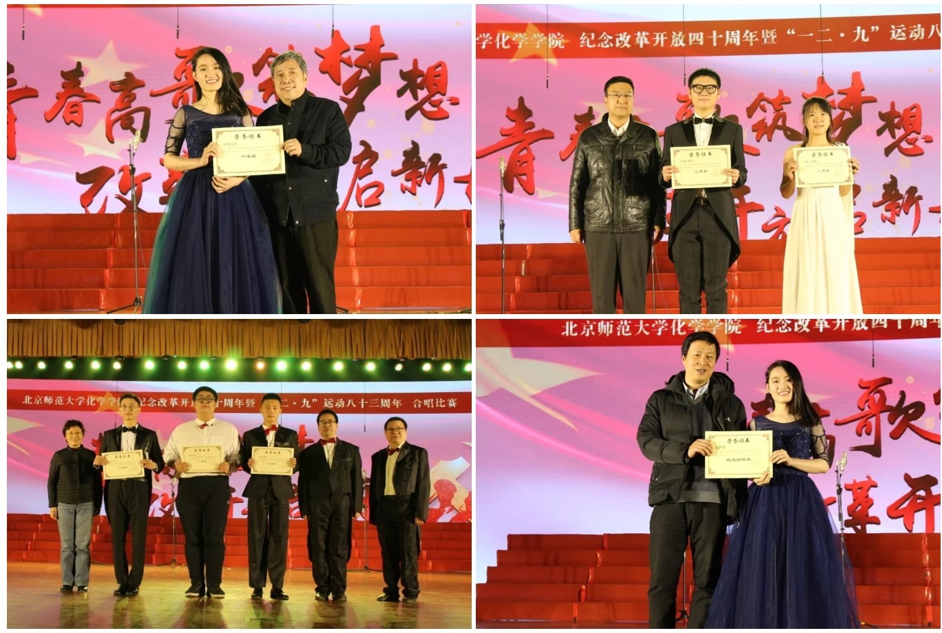 2018年12月2日晚,北京师范大学化学学院“青春高歌筑梦想,改革开放启新航”纪念改革开放四十周年暨“一二·九”运动八十三周年合唱比赛在学生活动中心隆重举行。北京师范大学大学校友总会副会长陈光巨老师、北京师范大学党委宣传部部长刘长旭老师、北京师范大学党委学生工作部副部长王显芳老师、数学科学学院团委书记谢天老师、统计学院团总支书记郭学茹老师作为特邀嘉宾莅临此次活动。我院党委书记卢忠林老师、院长范楼珍老师、副院长张俊波老师、副院长杨清正老师、党委副书记韩娟老师、工会主席蒋福宾老师及全院近600余名师生和家属代表现场观看了合唱晚会。北京师范大学艺术与传媒学院佟军老师、张艺耀老师、化学学院李品廉老师、门毅老师、郑积敏老师等5位老师担任本次合唱比赛的评委。