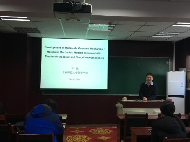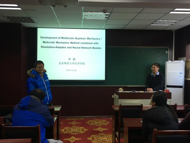 申林博士2018年9月年入职北京师范大学化学学院,主要研究兴趣包括量子化学从头算、分子动力学以及复杂化学体系的多尺度模型,近年来发展了基于量子力学/分子力学、全原子/粗粒化分子力场、以及增强采样和机器学习技术的计算方法,取得了一系列的研究成果。申林老师结合自身的科研经历,做了题为“Development of Multiscale Quantum Mechanics/Molecular Mechanics Method combined with Resolution-Adapted and Neural Network Models”的主题报告,报告深入浅出、内容丰富而详实,引起了相关领域研究工作者和研究生的极大兴趣。随后,申林老师与在座师生进行了热烈的讨论并就相关问题进行了深入的交流。
