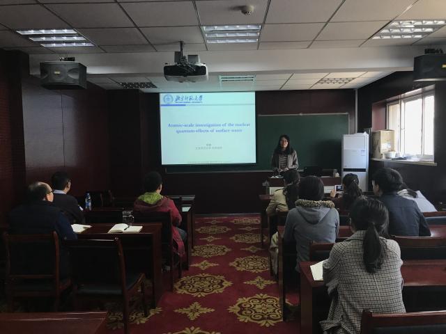 郭静教授2018年入职北京师范大学化学学院,主要从事基于扫描隧道显微镜/qPlus非接触式原子力显微镜的表面物理化学研究。近年来在尖端扫描探针技术的发展、表面水/冰的亚分子级分辨成像、质子转移动力学、核量子效应(量子隧穿和量子涨落)对水的氢键网络、氢键强度甚至表面异质催化的影响等方面取得一系列优秀的研究成果。郭静老师结合自身的科研经历,做了题为“Atomic-scale investigation of the nuclear quantum effects of surface water with STM/AFM”的主题报告,报告深入浅出、内容丰富而详实,引起了相关领域研究工作者和研究生的极大兴趣。随后,郭静老师与在座师生进行了热烈的讨论并就相关问题进行了深入的交流。
