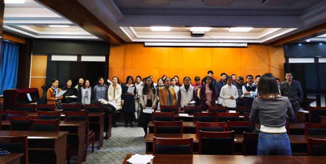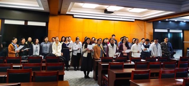 从2021年11月19日开始,化学学院工会就积极组织青年教师练习合唱,为参加学院“歌百年风华,颂千秋伟业”一二•九合唱比赛做准备。期间,每周一和周五中午12:00-13:00,全院青年教师四十余人都汇集在一起排练歌曲《珊瑚颂》。经过这段时间的排练,大家的演唱水平有了明显提高,精神抖擞,信心十足地准备迎接一二•九合唱比赛。12月11日,一二•九合唱比赛即将拉开序幕,晚会将以直播形式播出,化学学院教师合唱队将登台表演,预祝化学学院纪念一二•九运动合唱比赛圆满成功。