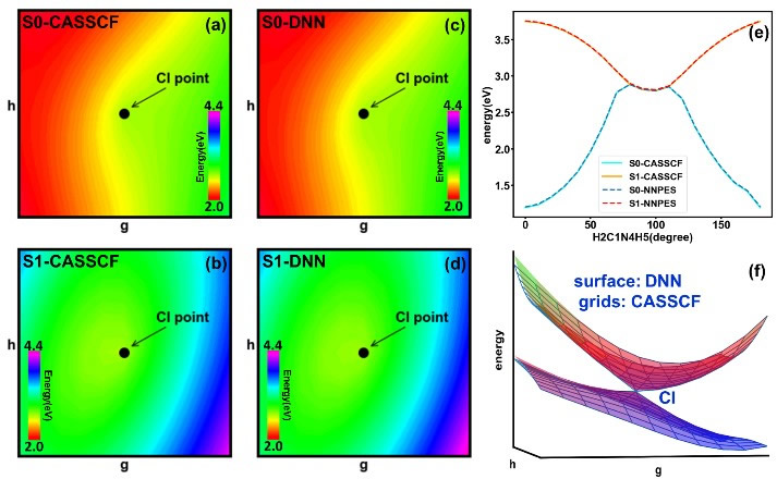 最近,化学学院崔刚龙老师利用基于神经网络的深度学习方法首次精确重现了多原子分子体系基态和激发态的势能面及其交叉区域的拓扑结构,并利用所得到的多态势能面进行了非绝热动力学模拟。基于深度学习的非绝热动力学模拟在降低计算量的同时,给出了和从头算级别非绝热动力学模拟近乎一样的动力学结果。结果表明深度学习方法可以足够准确地重复复杂的多态势能面的拓扑结构,可用于研究复杂的光物理和光化学反应动力学的研究。