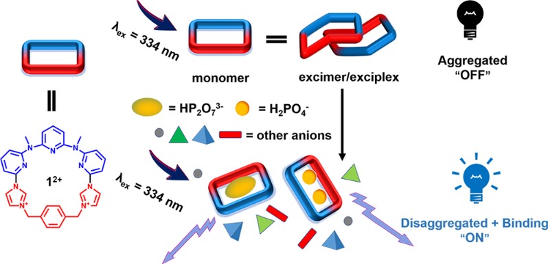 近期,化学学院龚汉元教授课题组报道一种新的阴离子传感方法,即激基复合物解聚诱导荧光发射(EDIE)。简而言之,在乙腈溶液中,新型大环传感器(环[1]1,4-二(1H-咪唑基) )亚甲基苯[1](2,6-二胺-二吡啶)吡啶的六氟磷酸盐本身具有弱的荧光发射,在光照条件下形成无荧光发射的激基复合物,其再与含氧阴离子(如焦磷酸根、磷酸氢根等)结合形成具有强荧光发射的大环-阴离子复合物(0.020 mM时荧光增强即可达200倍)。这使得传感器对焦磷酸根和磷酸氢根的检测十分灵敏和有效,而传感器对碳酸氢根的响应弱了许多,对硫酸氢根和硝酸根的响应更弱,对卤素离子、叠氮酸根、硫氰酸根等不含氧的阴离子则毫无响应。更重要的是,大环传感器能在所检测的含有众多阴离子溶液中高选择性地识别焦磷酸根和磷酸酸根,这是传感器自身缔合以及其与阴离子竞争性结合综合作用的结果。X-射线单晶衍射结构分析也支持这一结论。