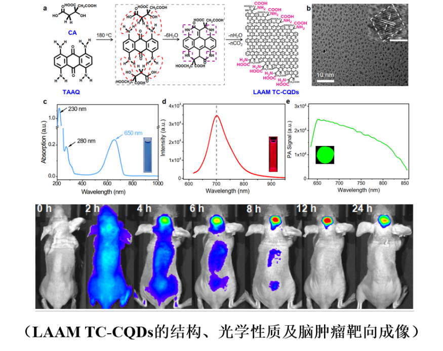 该研究工作近期发表在《Nature Biomedical Engineering》杂志上 (Targeted tumour theranostics in mice via carbon quantum dots structurally mimicking large amino acids)。北京师范大学化学学院为第一完成单位。化学学院博士生李淑花,宿雯和吴浩为论文的共同第一作者,范楼珍教授、朱嘉副教授和耶鲁大学周江兵教授为共同通讯作者。相关技术成果已经申请了国际发明专利(PCT/CN2019/115263)。LAAM TC-CQDs成功入选美国NCL (Nanotechnology Characterization Laboratory)的Assay Cascade Awardees。NCL将为这一项目提供免费临床前安全评价、药效和药物代谢等实验。据悉,这是来自中国大陆的首例入选项目。该研究得到国家自然科学基金,理论及计算光化学教育部重点实验室和放射性药物教育部重点实验室资助。