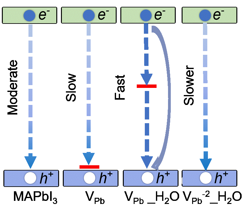近年来,有机-无机杂化钙钛矿材料成为光伏能源领域的明星材料,受到了广泛关注。通常认为钙钛矿具有优秀的缺陷容忍性,对激发态寿命影响很小。但是,声子协助的非辐射电荷复合导致激发态电子能量损失,阻碍了光伏器件效率的持续提高。材料和器件通常暴露在空气中,水分对器件的性能影响十分显著。实验发现水对钙钛矿激发态寿命有正面和负面的影响,但是其背后的物理机制不清楚。我们前期的工作表明,少量的水份降低了电声耦合,延缓非辐射电子-空穴复合,大量的水分形成氢键网络,增强了非绝热耦合强度,加快了复合 (J. Phys. Chem. Lett., 2016, 7, 3215−3222)。