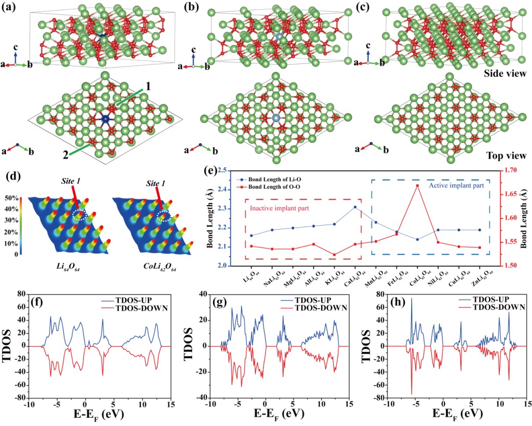 基于上述问题,北京师范大学化学学院孙根班教授团队与加州大学圣克鲁兹分校陈少伟教授团队合作,利用原位电化学植入法结合理论计算模拟,构建了一种锂空气电池自催化新体系,并系统地研究了其反应机理及电池性能。该工作首先基于密度泛函理论(DFT)进行了理论研究,发现通过金属离子掺杂放电产物Li2O2可显著提升LAB性能,进而通过理论计算指导实验筛选出最有效的掺杂元素为Co元素。与原始Li2O2相比,CoLi2-xO2具有显著增强的导电性、拉长的O-O键和降低的分解势垒。实验中,在电化学过程中将金属离子原位嵌入放电产物Li2O2,实现产物结构的内在调控,有效促进了Li2O2的分解。这是由于在充放电过程中,Co-Ox位点可作为自催化活性中心,避免多相界面的形成,促进Li2-xO2的分解,实现放电产物的自催化。与传统锂空气电池(TLAB)相比,这种自催化锂空气电池(SCLAB)的过电位仅为0.84V。在低极化下可超过118个循环,并实现3000 mA g-1的快充性能,在10分钟内快速充电至满容量,循环次数为260次。本结果突出了原位结构工程在提高电化学能源技术性能方面的重要性,同时为新型高性能锂空气电池体系的开发和设计提供了全新的思路。