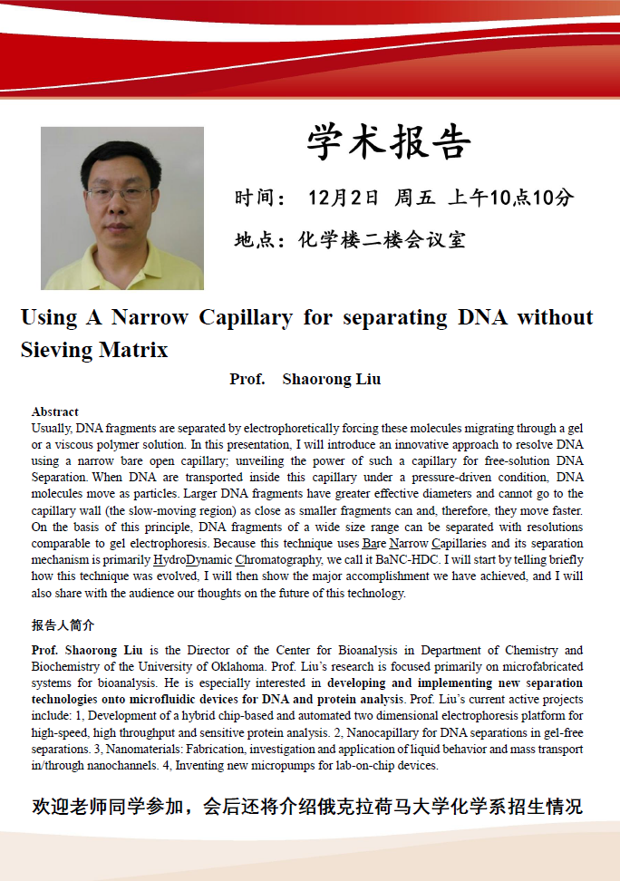 学术报告:俄克拉荷马大学Shaorong Liu教授,Using A Narrow Capillary for Separating DNA without Sieving Matrix