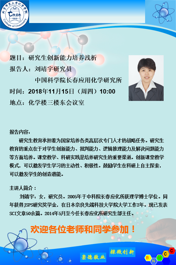 学术报告:中国科学院长春应用化学研究所,刘靖宇研究员,研究生创新能力培养浅析