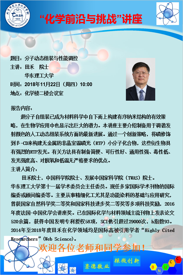 学术报告:华东理工大学,田禾 院士,分子动态组装与性能调控