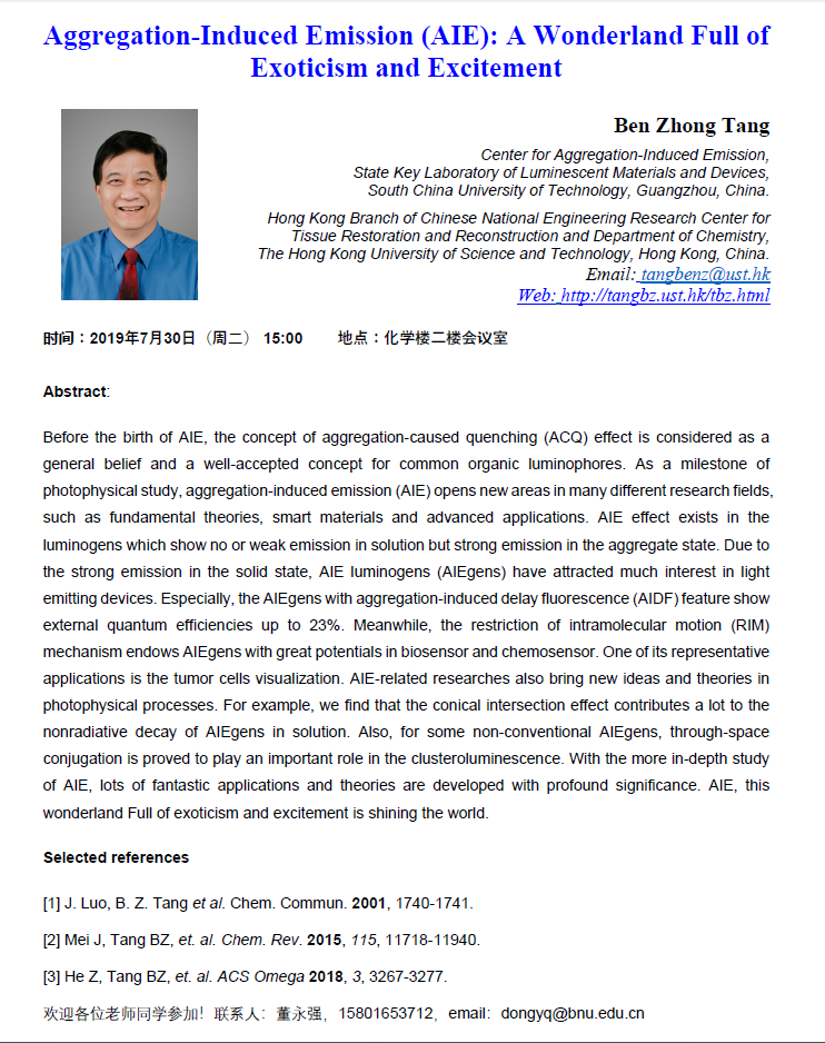 学术报告:唐本忠院士,香港科技大学,Aggregation-Induced Emission (AIE): A Wonderland Full of Exoticism and Excitement