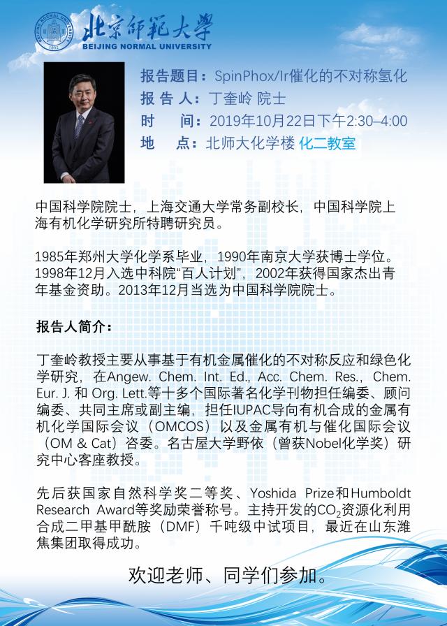 学术报告:上海交通大学,丁奎岭院士,SpinPhox/Ir催化的不对称氢化