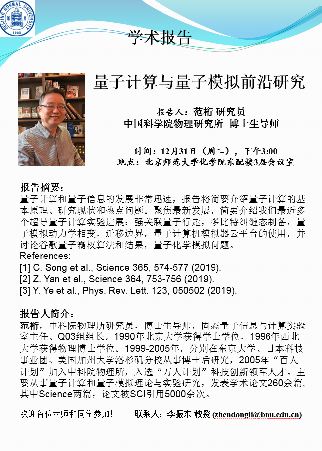 学术报告:中国科学院物理研究所,范桁研究员,量子计算与量子模拟前沿研究