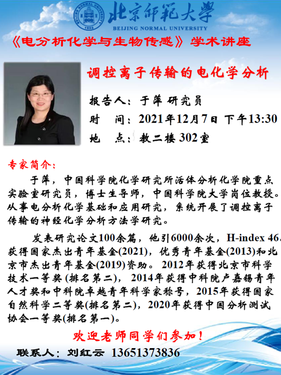 学术报告:中国科学院化学研究所,于萍 研究员,调控离子传输的电化学分析