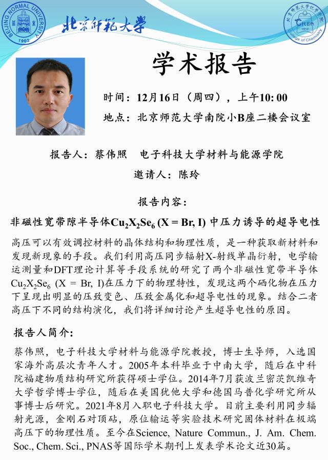 学术报告:电子科技大学材料与能源学院,蔡伟照教授,非磁性宽带隙半导体Cu2X2Se6 (X = Br, I) 中压力诱导的超导电性