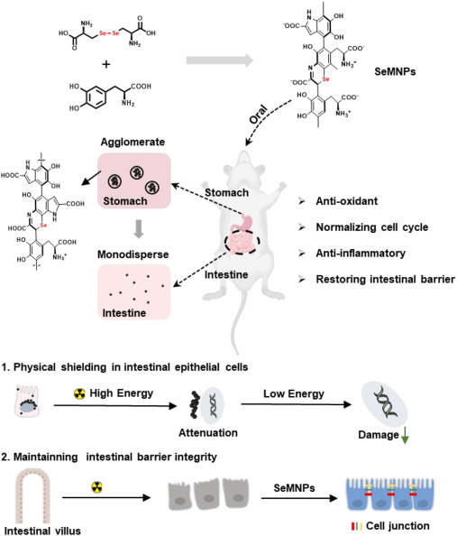 对此,北京师范大学曹玮教授提出了将硒代半胱氨酸修饰的黑色素纳米颗粒(SeMNPs)用于肠道放射防护的策略。引入硒增加了黑色素对辐射能量的衰减,并表现出卓越的抗氧化性能,同时在胃肠道环境中保持稳定的活性,并能够精确调节释放动力学,使其成为肠道损伤口服治疗的理想选择。口服后,SeMNPs有效减轻辐照引起的肠道损伤,并将小鼠全身照射后的存活率从20%提高到100%。这项研究为用于体内放射防护、口服药物和基于生物大分子的新兴材料开发提供了有价值的参考。