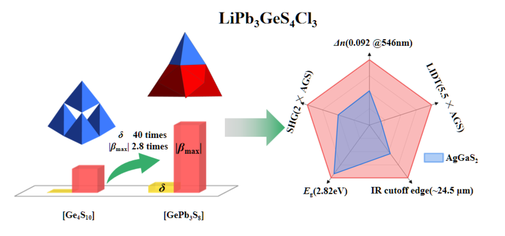 在此基础上,该工作进一步拓展了ABUCB的设计理念。从利用不同化学键之间的差异扩展到了利用不同四面体之间的差异。通过组合不同种类的金属配位四面体构建杂化超四面体,大幅增强结构的各向异性。在本研究中,构建了一个T2型杂化超四面体, [GePb3S8],其超极化率和极化率各向异性分别可达到传统T2超四面体[Ge4S10]的2.8倍和40倍。进一步以T2型杂化超四面体[GePb3S8]作为基元,设计合成了一系列LixPb3.5-x/2GeS4Cl3 (x = 1-0)样品。其中,LiPb3GeS4Cl3表现出最为卓著的光学性能(SHG = 2.0 × AgGaS2 (AGS),LIDT = 5.5 × AGS,Eg(obv.) = 2.81 eV,∆nobv = 0.092 @546 nm),超过了已报道硫代锗酸盐卤化物和Tn超四面体硫属化物的非线性光学性能。通过实验和理论的结合研究,他们还证明了Li的取代有效地激活了费米能级附近的电子态,包括Pb-6s2上的孤电子对,S-3p和Cl-3p轨道的非成键态。该工作通过建立杂化金属超四面体这一类新的各向异性结构单元,实现超极化率和极化率各向异性的协同提升。该工作进一步拓宽了ABUCB设计理念,为高性能光学晶体材料的合理设计开辟了新途径。