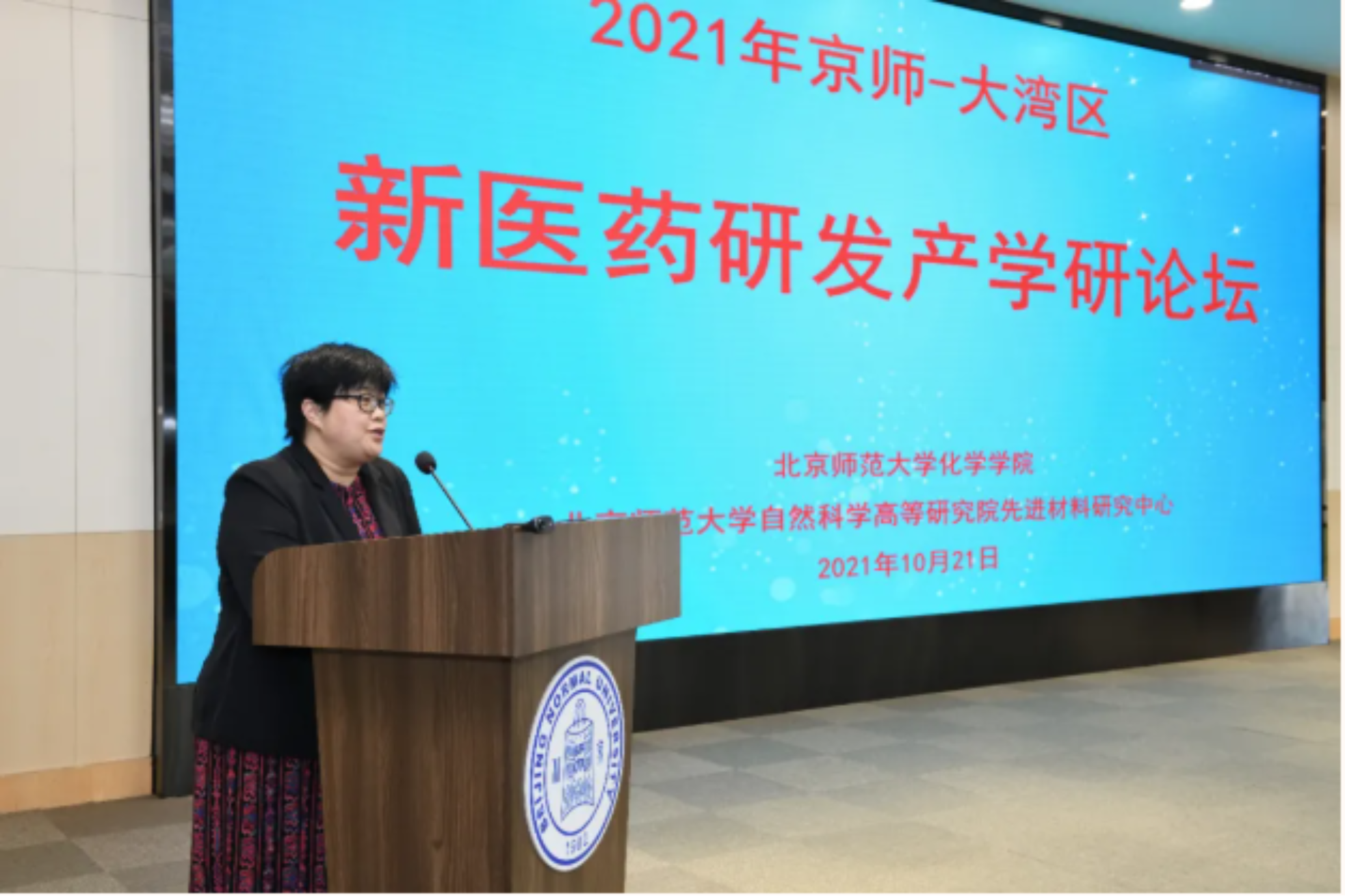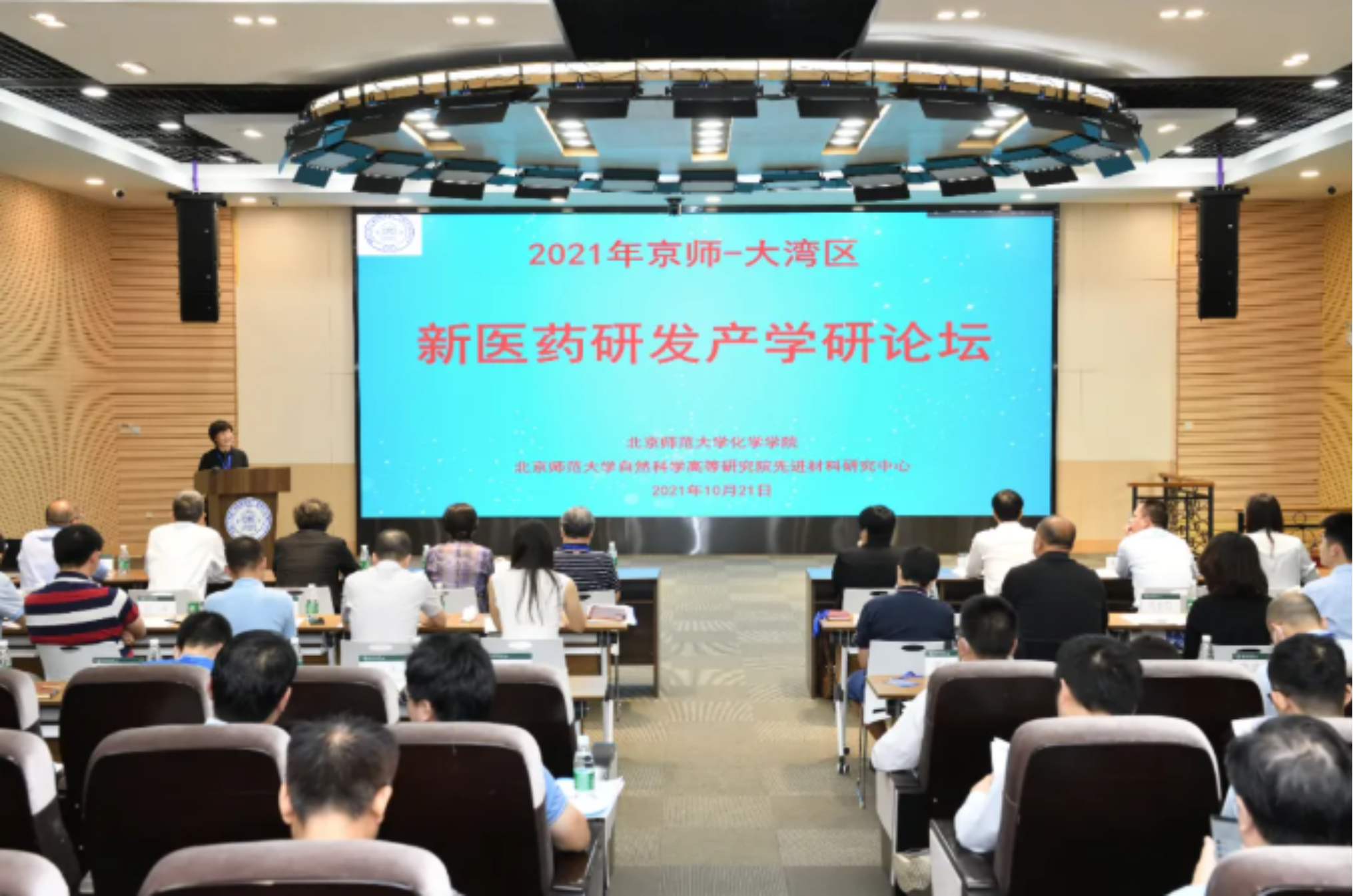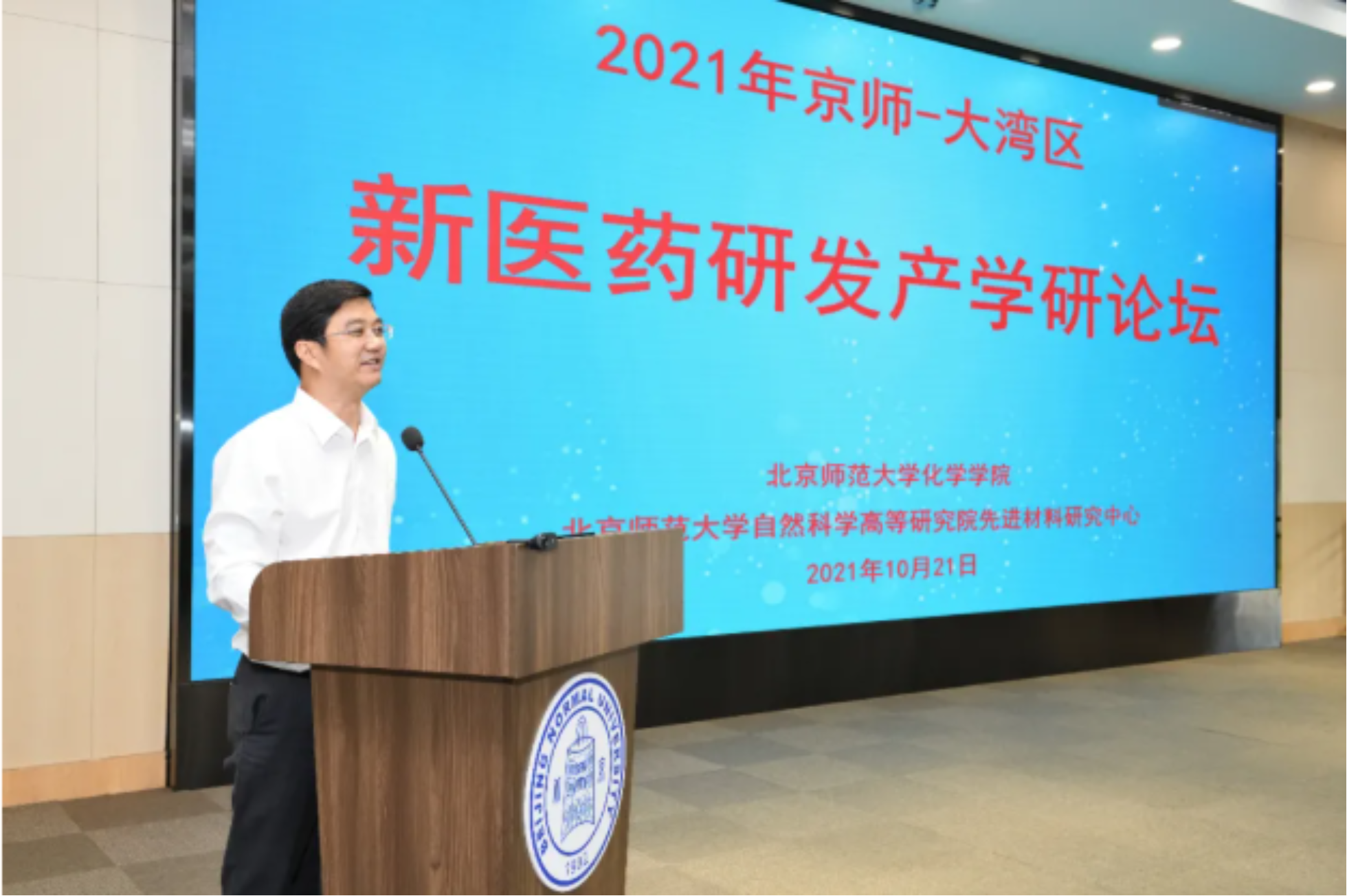 为响应创新型国家发展战略,坚持科技事业发展的“四个面向”,2021年10月20-22日,由北京师范大学化学学院、北京师范大学自然科学高等研究院先进材料研究中心主办、珠海高新区生物医药和医疗器械产业发展办公室支持的“2021年京师-大湾区新医药研发产学研论坛”在北京师范大学珠海校区顺利召开。本次论坛聚焦新医药领域的产学研政合作,来自北京师范大学、中国食品药品检定研究院、珠海高新区管委会、丽珠医药、新领先(北京)医药科技公司、海普洛斯、新师者教育研究院、北京和谐伟业化学科技有限公司、纳思达股份有限公司、GE药业等20多个单位的50多名专家和代表参加了论坛,共同探讨未来医药研发新动向。