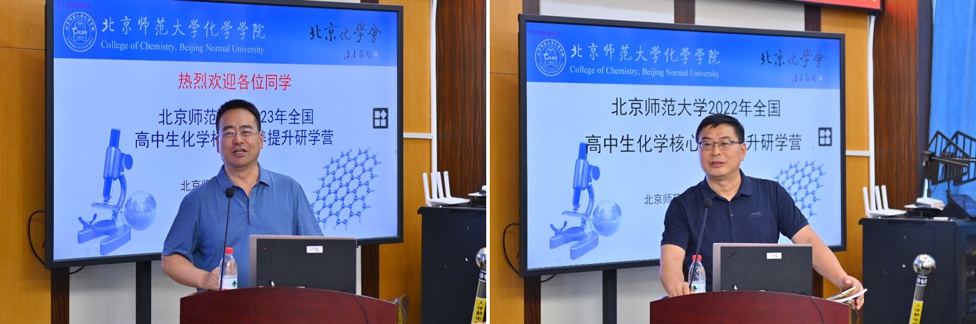 7月24日上午开营仪式上,化学学院党委书记卢忠林老师对参加此次研学营的同学表示热烈欢迎,从多个方面介绍了北京师范大学及化学学科,并结合往期举办情况介绍了研学营的特色和理念。孙根班老师代表北京化学会进行发言,介绍了研学营的意义和北京化学会的相关工作,希望营员通次本次研学营能有所收获。本次研学营坚持“理论与实验相结合,基础与前沿相结合,知识与思维相结合”,共包括5天的课程。