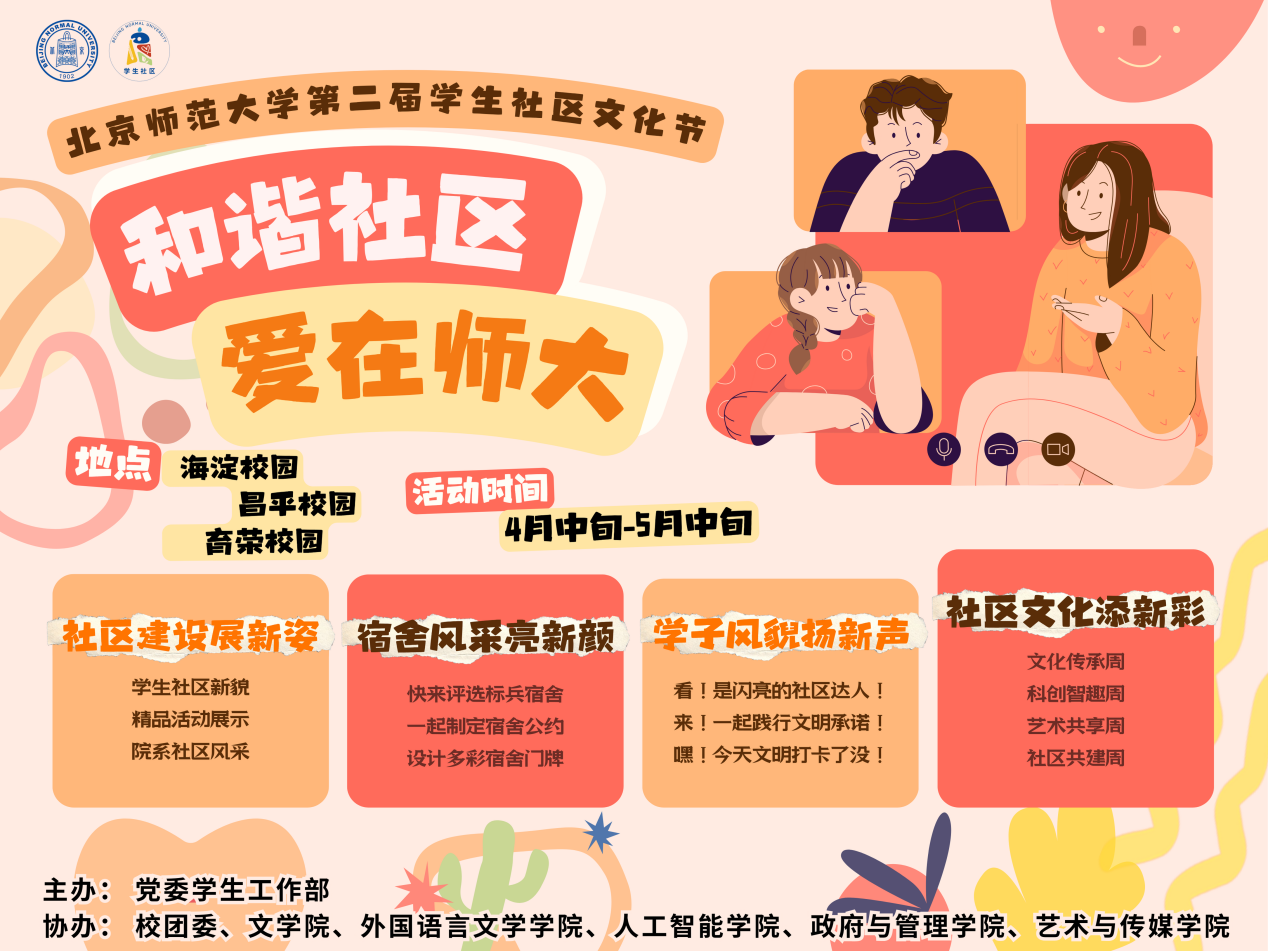 为进一步推进学生社区建设,总结凝练学生社区工作的相关成果和优秀经验,北京师范大学第二届社区文化节特设置“社区建设展新姿”模块,将通过“京师学工”公众号展示各院(系)社区建设工作的创新成果与特色育人方案,旨在充分发挥学生社区的育人功能,推动我校学生社区建设先进经验的交流与分享,促进各院(系)学生社区日常管理、文化建设等工作的共同进步。