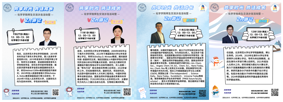 为构建本研贯通式成长生态,厚植师生共融共进育人土壤,化学学院创新推出“Zn游记”特别企划。以“共享时光·共话成长”师生交流沙龙活动为载体,开启“Zn游记”系列成长叙事。我们以锌元素的活泼特性为灵感,催化知识传递、情感联结与价值共创的链式反应,让每一次对话都成为点亮思维的电子跃迁。活动采用主题漫谈形式,聚焦学业进阶、科研探索、生涯发展等成长议题,每期特邀院(系)教师与青年学子展开“锌锌相印”的深度对话。通过构建平等开放的交流场域,搭建教学相长的互动平台,让知识在思维碰撞中迭代,让困惑在智慧启迪中消融,让理想在经验传承中明晰。