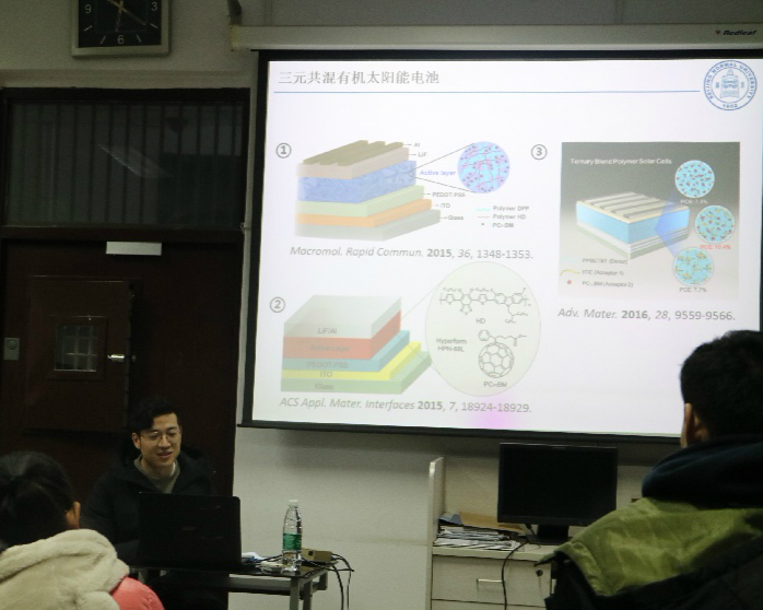2017年12月10日,由北京师范大学化学学院研究生会举办的“石玉”科研工作坊第二场太阳能电池器件制备及光伏性能研究方法在化学楼119室举办,本次学术活动邀请了北京师范大学化学学院高分子化学与物理专业在读博士生陆恒师兄担任主讲嘉宾。