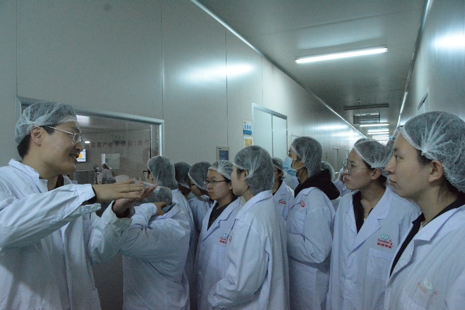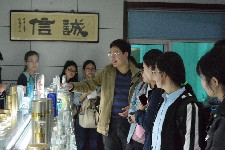 在人力资源部张经理、化妆品车间唐经理的带领下,同学们走进了陈列着三百余种产品的展示厅。唐经理告诉大家,日光集团不仅拥有像久朋、久恒、芳丽洁等多个洗涤剂品牌与如花、颐缘、古桑、凡可迪等化妆品自主品牌,同时还为医疗机构和美容机构代工生产化妆品等产品,例如为同学们所熟知的维生素E乳与硅霜等知名产品。接下来,唐经理细致地讲解了日光的洗涤产品——针对玻璃、毛毯等不同物品的洗涤剂和处理剂与针对血渍、葡萄渍等不同污渍的清洁剂。琳琅满目、丰富多彩的日光产品不仅让同学们大开眼界,惊叹于化工产业的神奇与魅力,也深深感受到日光集团专注钻研的工匠精神、厚积薄发的创新能力及其前景广阔的发展道路!