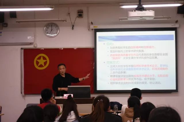 首先,汪老师具体地介绍了“京师杯”课外学术科技作品竞赛的比赛章程、目的、竞赛方式以及作品申报有关的限定条件和特殊要求,让我们对“京师杯”课外学术科技作品竞赛有了更深层次的了解。他结合了往届学生申报的实例,从作品的组成生动形象地介绍了怎样才是一个优秀的“京师杯”作品。然后他从多方面讲述了怎么书写一篇优秀的“京师杯”作品,其中最重要的方面就是不能出现低级错误。