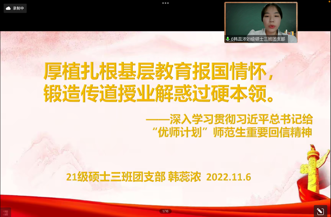 这些精神不仅仅是针对优师计划的同学们,更是千千万万的有志青年的共同信念,作为北师大学子要肩负起责任,将个人理想融入党和国家发展事业中,为实现中华民族伟大复兴的中国梦贡献青春力量。而身为一名化学人,让我更清楚化学教育的重要使命,使学生在学习中培养良好的逻辑思维能力和创新精神。