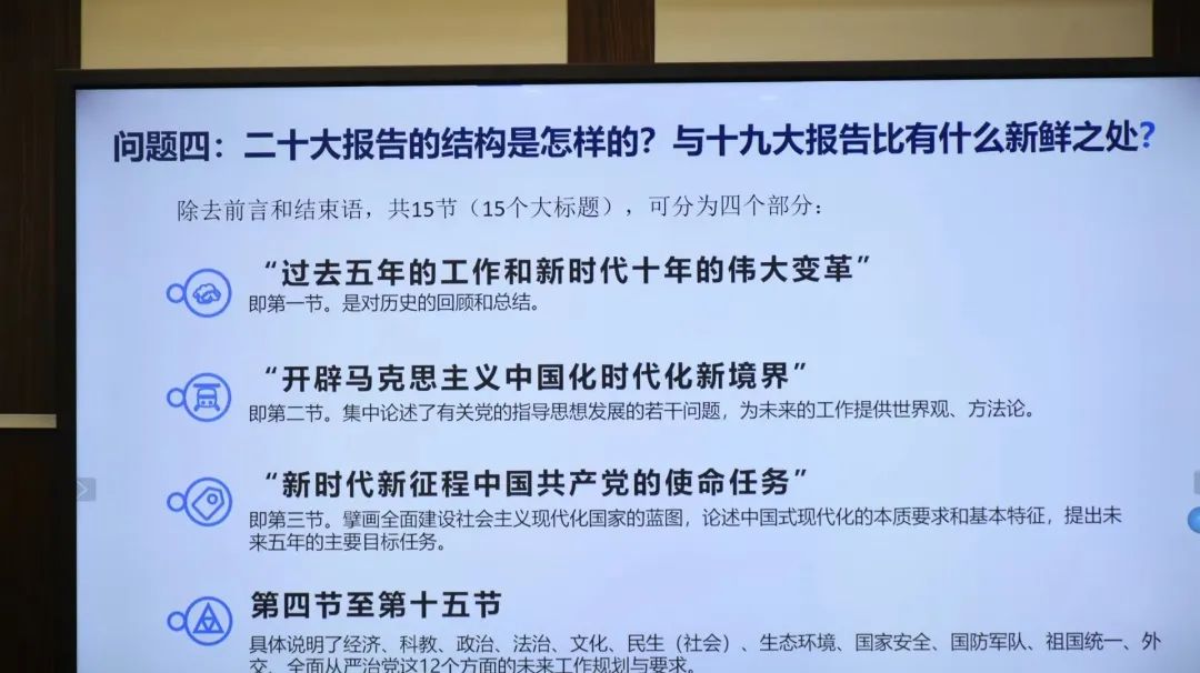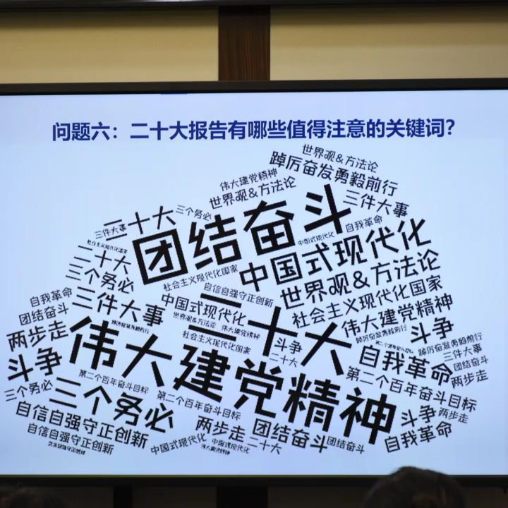 同学们列举了二十大报告中对自己影响颇深的关键词,回顾党筚路蓝缕、攻坚克难后取得的宏伟成就,展望党踔厉奋发、笃行不怠中光明的未来。
