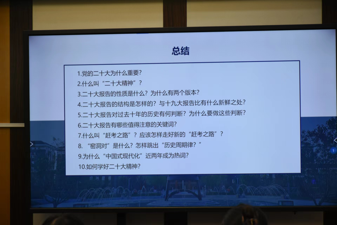 会议伊始,马克思主义学院的张经纬同学在调查了同学们对政治的了解程度后,用十个问题,系统地讲述了二十大精神。