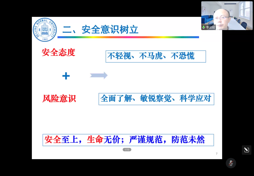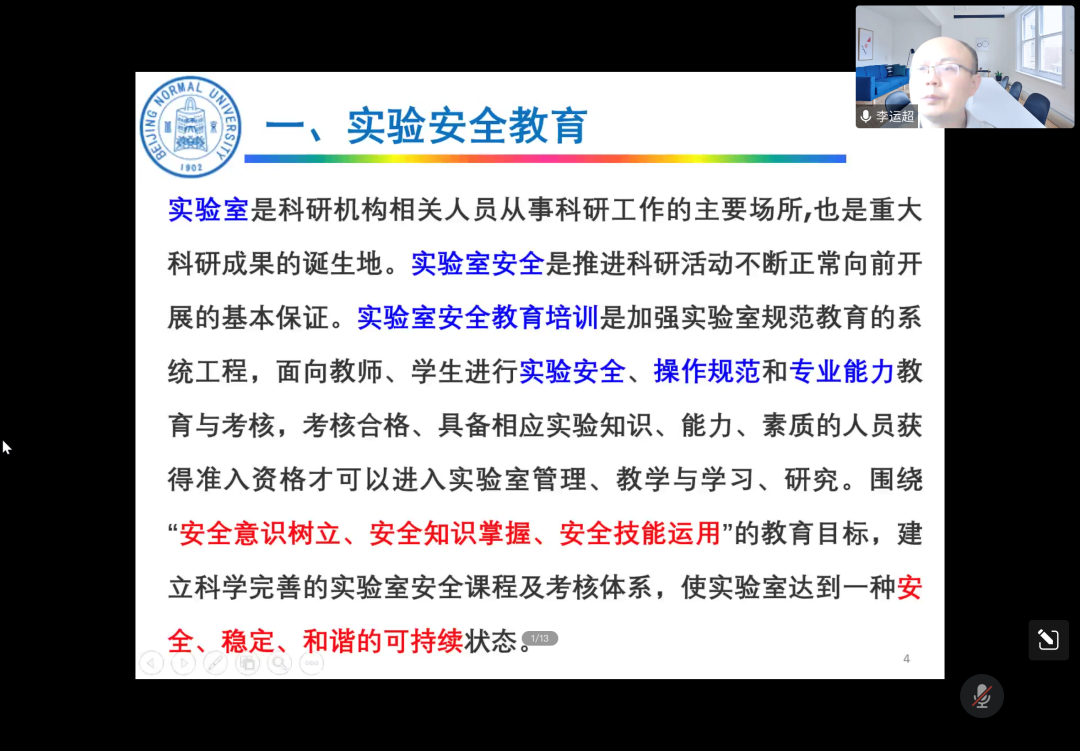 随后,李老师向同学们分享北京师范大学安全知识与培训的网站,以及化学与化工实验室安全的慕课。他叮嘱同学们认真学习实验室安全知识,并及时完成实验室安全教育线上考试。同时,他还鼓励同学们积极参加学校与学院举办的实验室安全文化月,以及消防安全演练等活动。