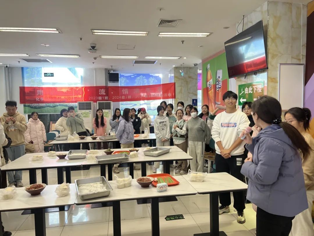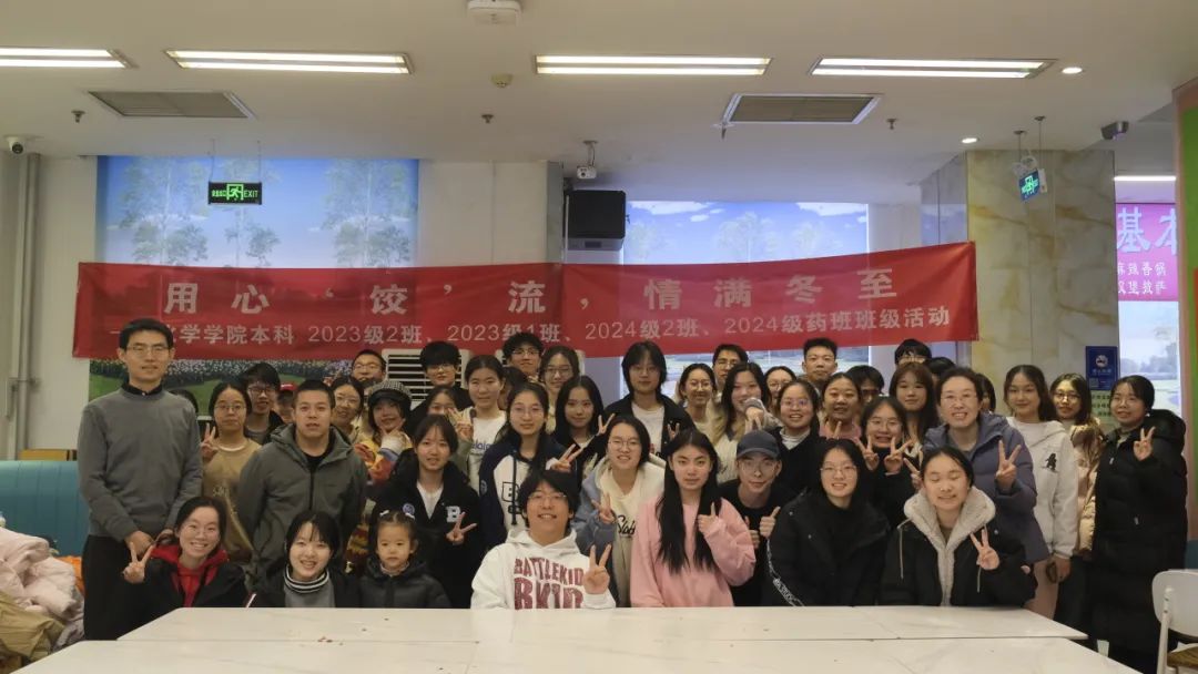 为弘扬传统文化、促进师生交流,化学学院2024级本科2班、2024级药班、2023级本科1班、2023级本科2班于2024年12月21日在新乐群食堂三楼共同举办“用心‘饺’流,情满冬至”饺子节活动。活动邀请到化学学院党委副书记马琼老师、2024级本科药班班主任曹玮老师、2023级本科2班班主任刘广建老师参与。60余名化学学院师生齐聚一堂,在严寒的冬日感受家的温暖,传递同窗温情。