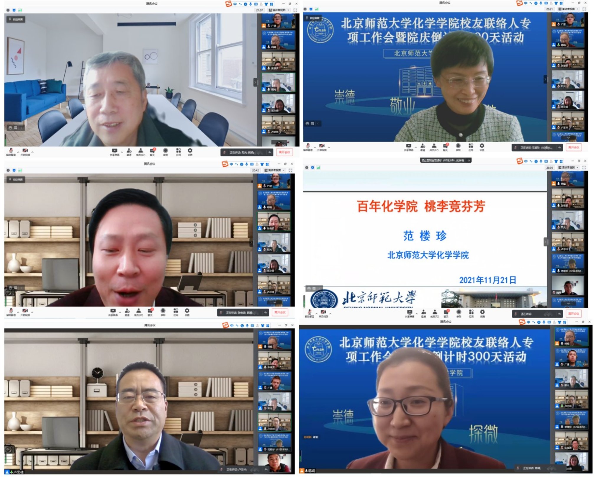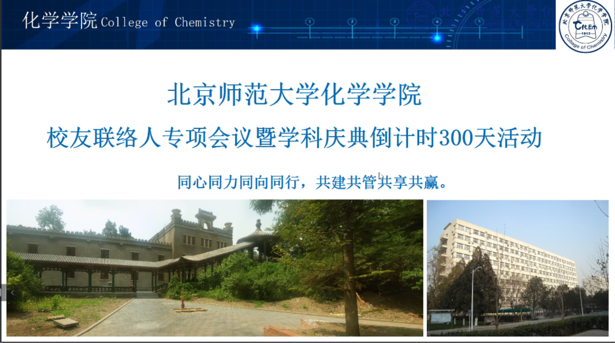 2021年11月21日下午,北京师范大学化学学院校友联络人专项工作会暨学科庆典倒计时300天活动在线上顺利召开。北京师范大学校友总会副会长、化学学院教授陈光巨老师,北京师范大学校友总会秘书长范文霞老师,化学学院党委书记卢忠林老师,化学学院院长范楼珍老师,学院副院长张俊波老师,学院党委副书记韩娟老师,化学学院校友联络人等80人参加会议。会议以“同心同力同向同行,共建共管共享共赢”为主题,由学院党委副书记韩娟老师主持。