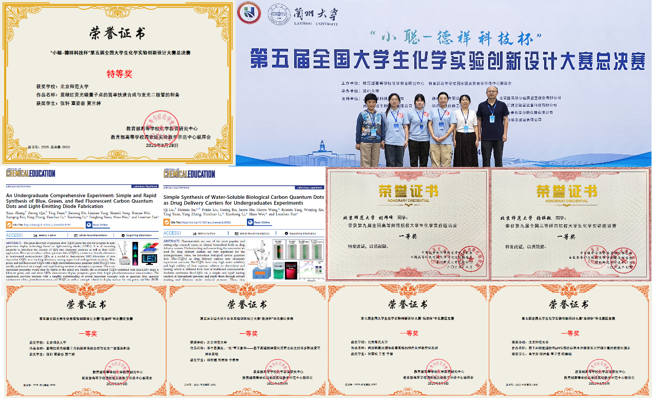 化学学院本科生张轩、覃姿容、贾兰婷凭借参赛作品“蓝绿红荧光量子点的简单快速合成与发光二极管的制备”,以扎实的专业基础、创新的实验设计和出色的现场表现,荣获全国总决赛特等奖(指导教师范楼珍教授和袁廷博士)。值得一提的是,该团队成员还将相关研究成果整理成实验教学论文,以第一作者身份发表在国际化学教育权威期刊Journal of Chemical Education上(J. Chem. Educ. 2025, 102, 1223-1229)。